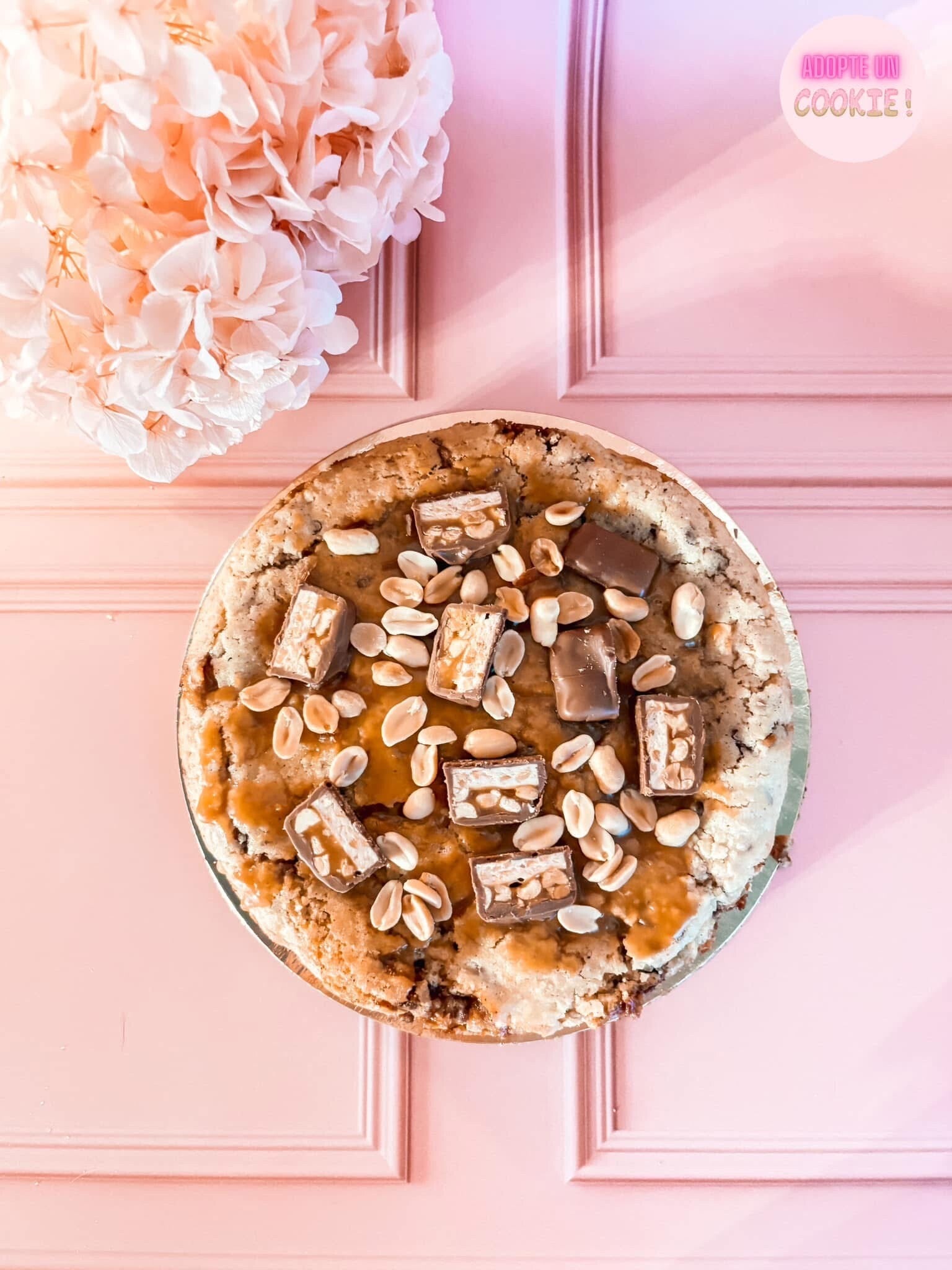 Cookie goût snickers ( morceaux de snickers dans la base du cookie / fourrage caramel / topping caramel , snickers et cacahuètes)