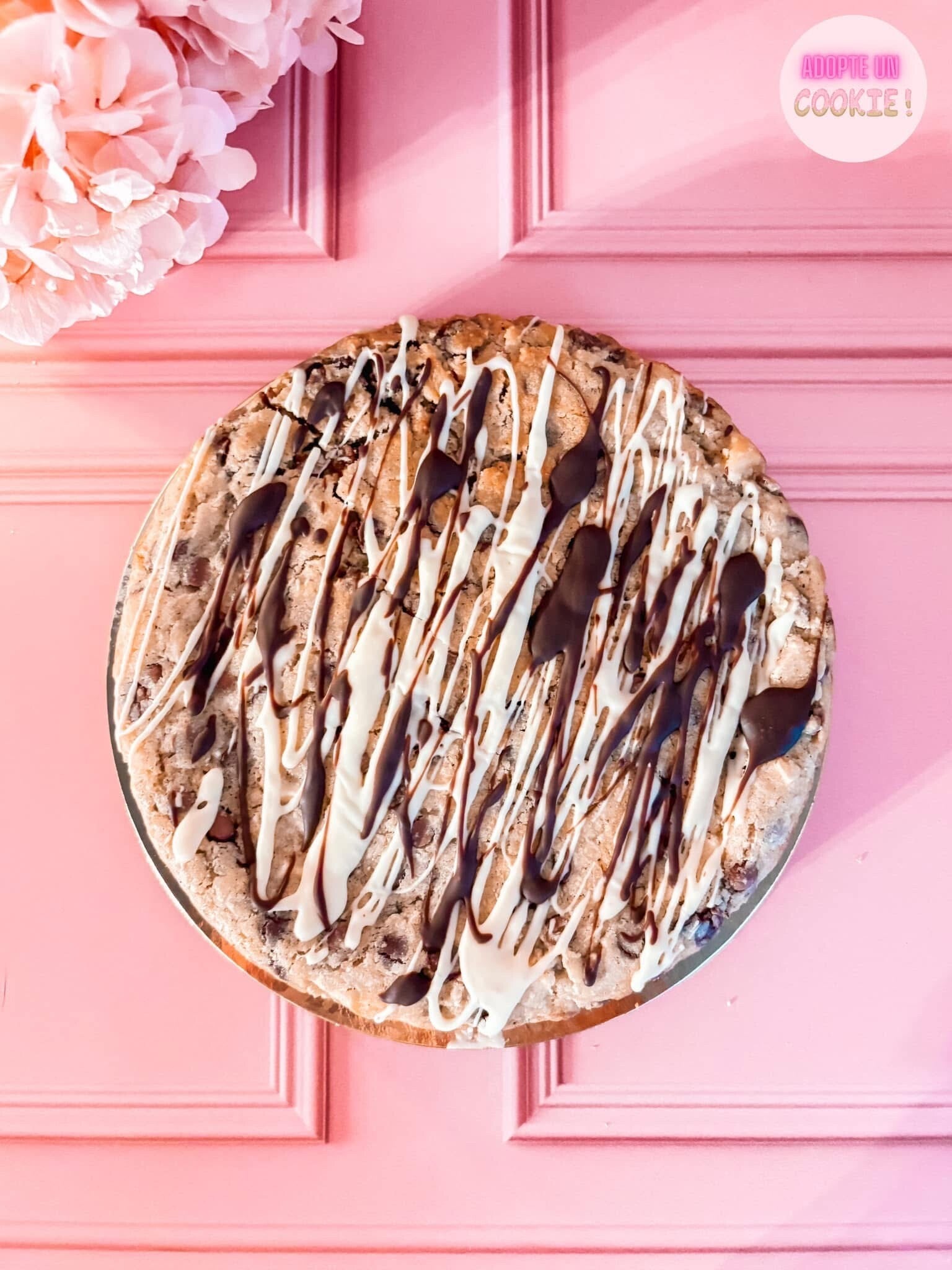 Cookie goût snickers ( pépite de chocolat au lait , noir et blanche dans la base du cookie / topping chocolat noir et blanc )